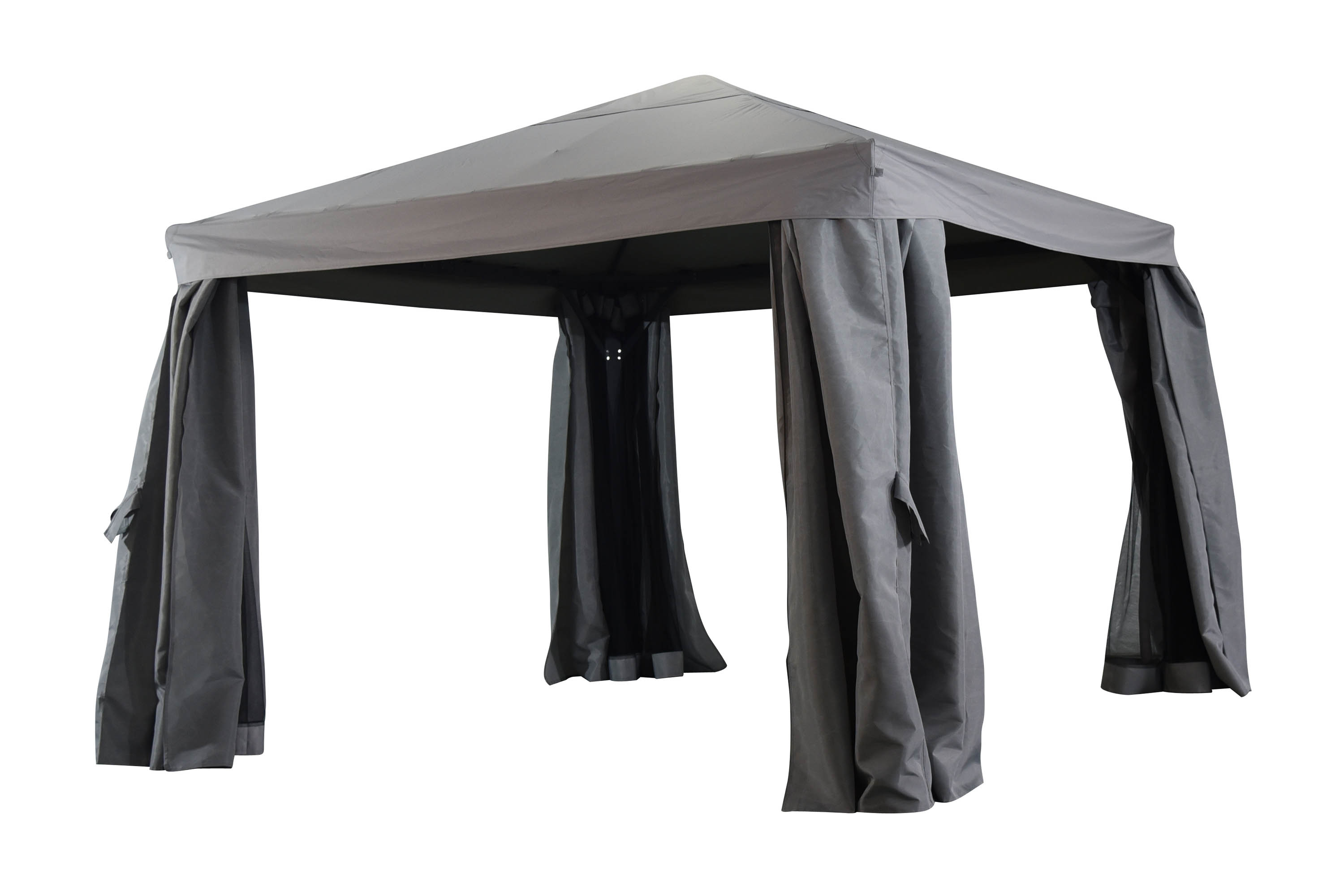 En praktisk aluminiumspavillon, der yder fremragende beskyttelse mod regn, sol, vind og irriterende insekter. Fås i to forskellige størrelser og har stel i antracit med tekstil i grå eller beige.