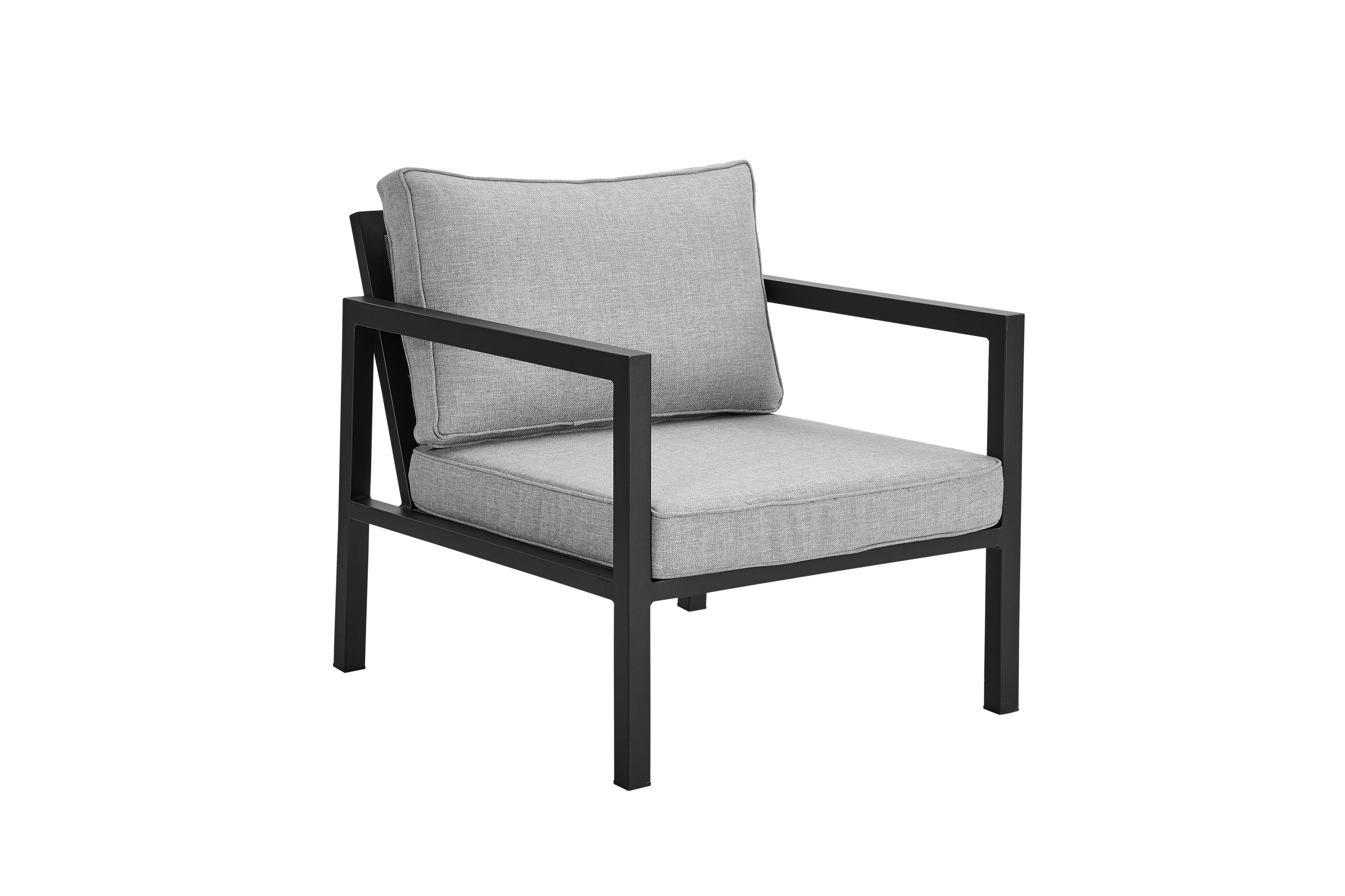 En moderne loungeserie med fremragende siddekomfort. Du kan vælge mellem mat hvid eller sort aluminium med gråt tekstilen og de tilhørende hynder er af høj kvalitet og betrukket med olefinstof. Serien består af flere separate dele, der giver dig frihed til at skabe en hyggelig og funktionel terrasse, uanset om den er lille eller stor.