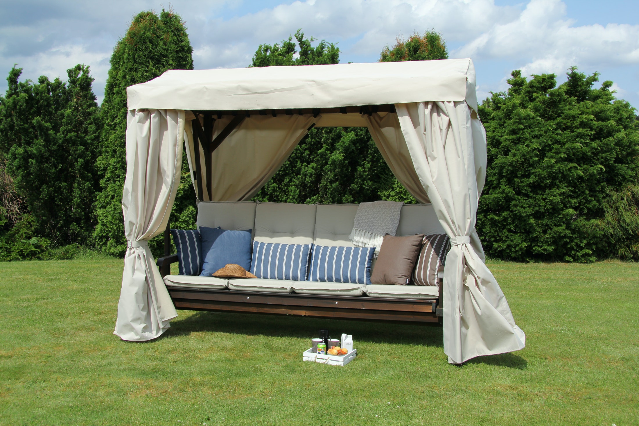 Til vinteropbevaring kan vi anbefale at opbevare hynder og taget i et skur eller en garage, og herefter dække stativet med et hængekøjeovertræk. Det gør, at møblet holder sig rigtig fint længe, og at du kan fortsætte med at nyde det i lang tid fremover.