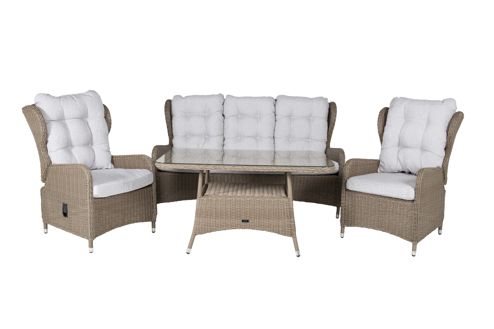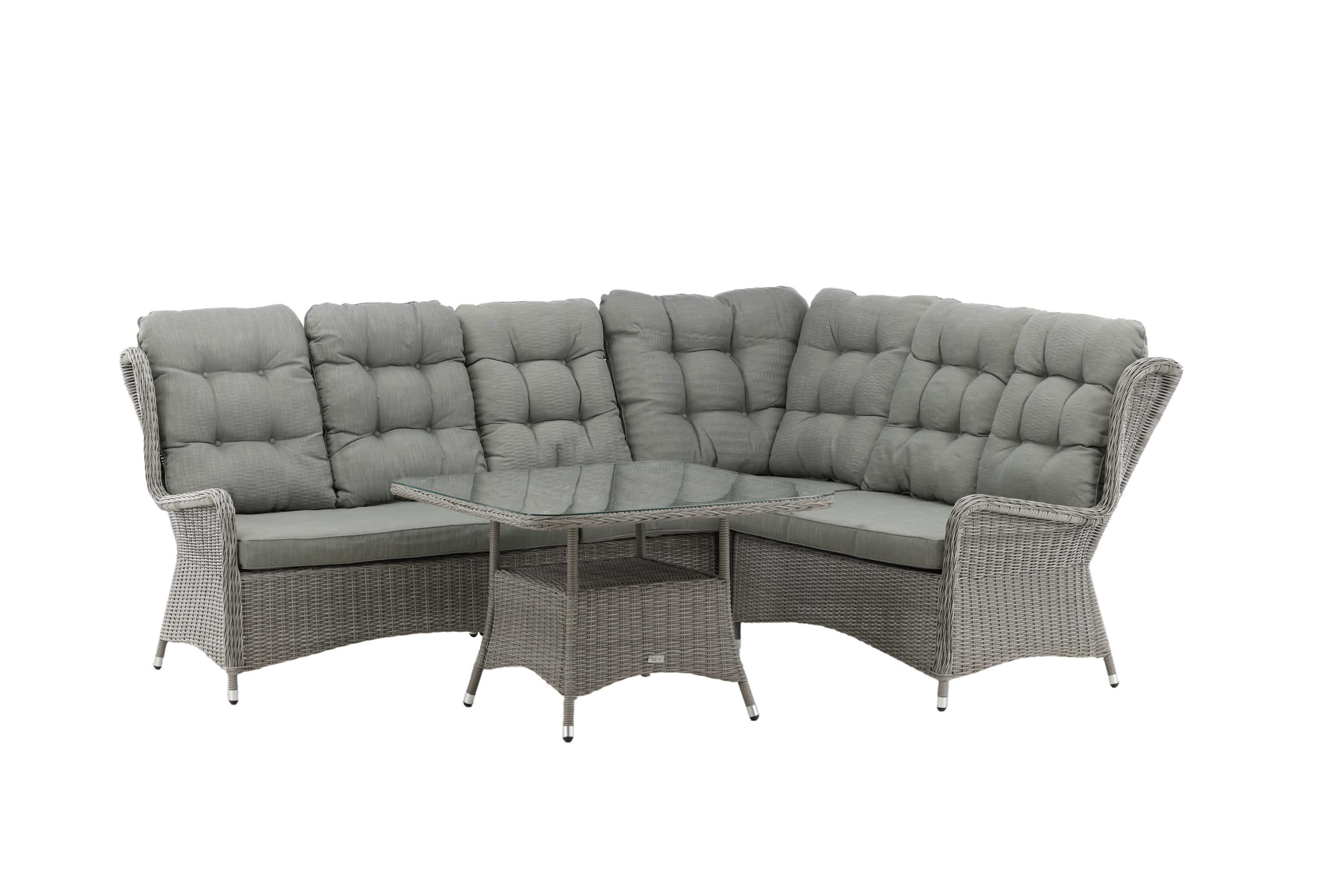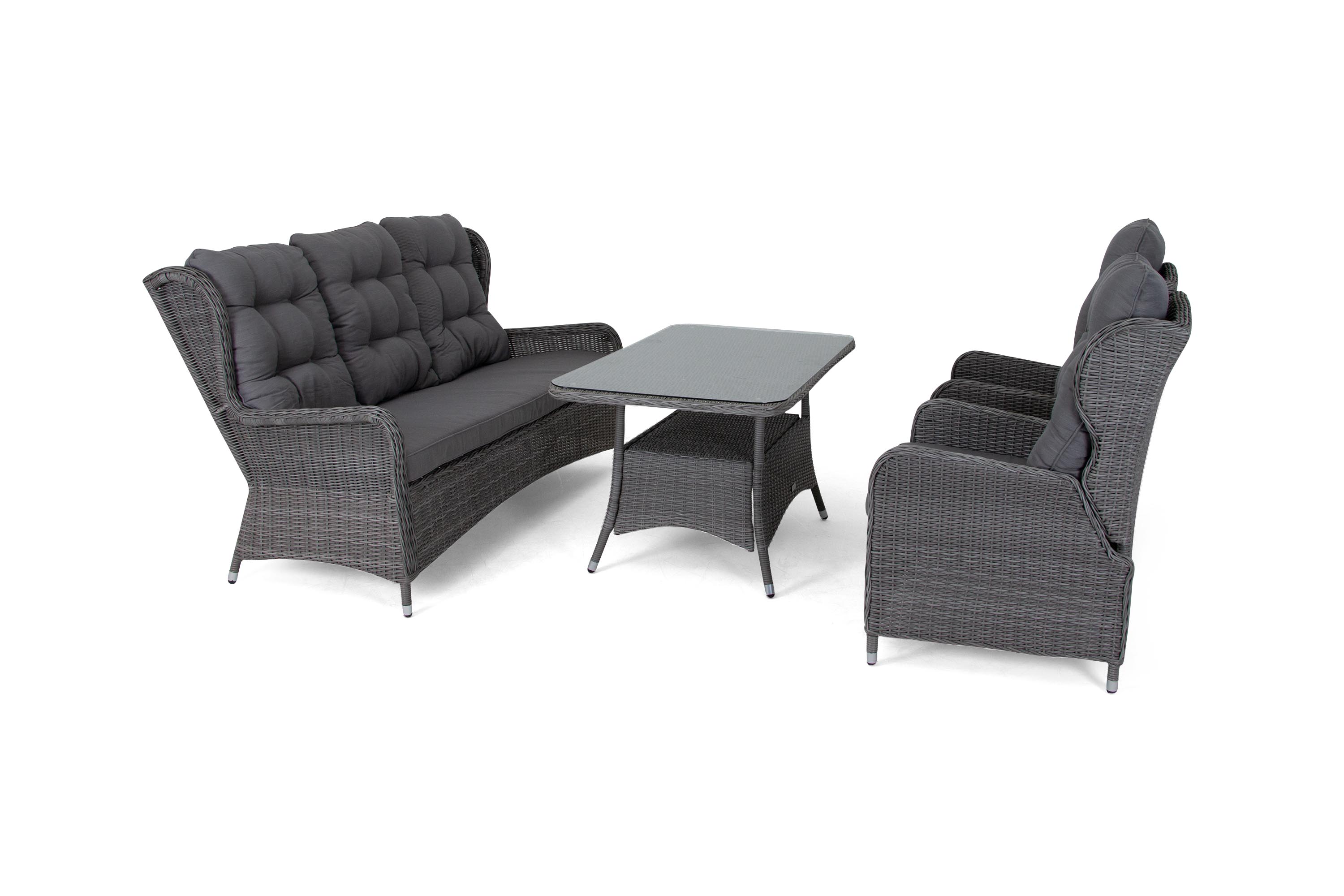 Washington cafégruppGrå med grå dynor2 positionsfåtöljer, fotpallar & sidobord